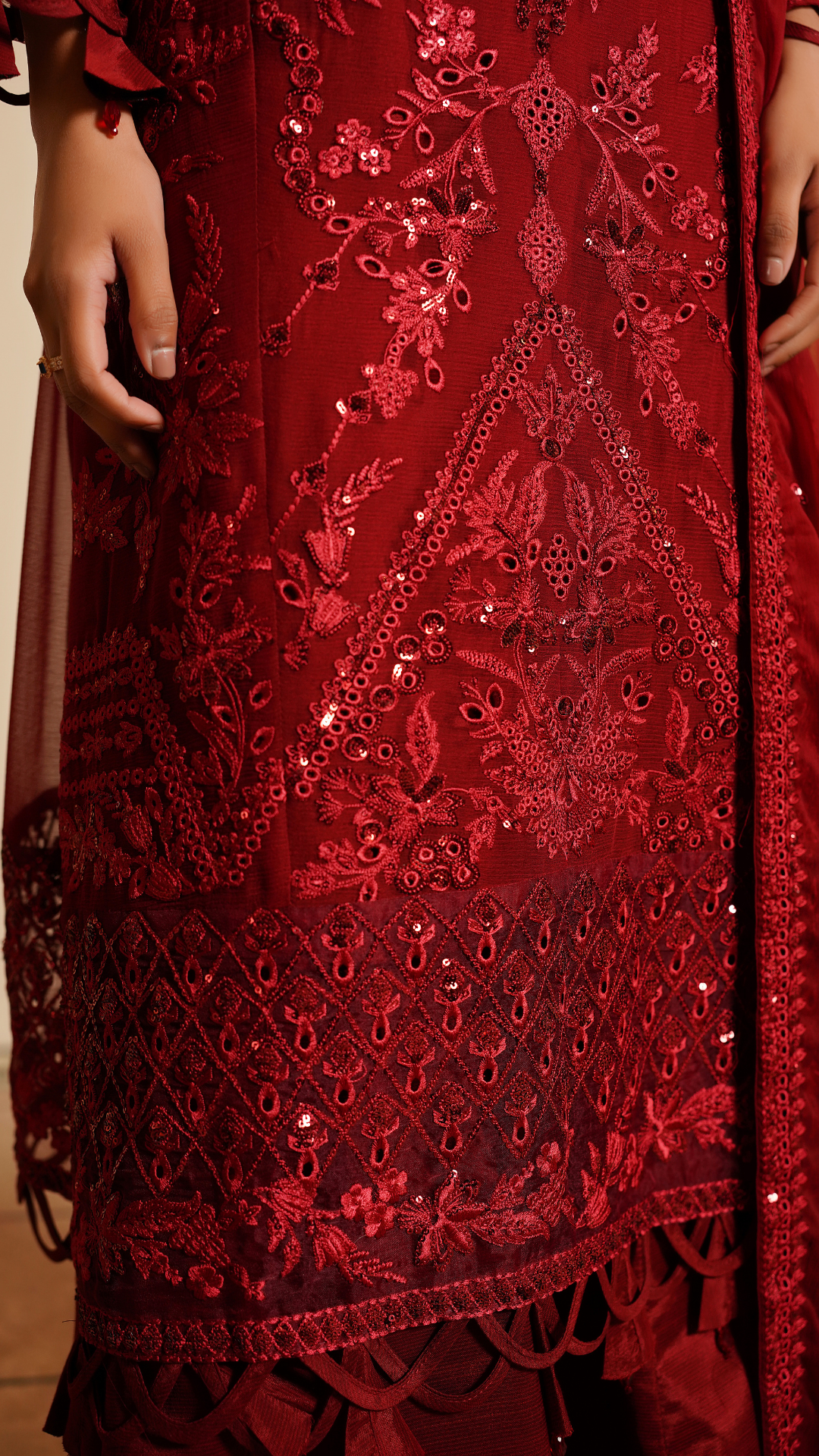 Embroidered weightless chiffon front 1 yds Plain weightless chiffon back 1 yds Embroidered weightless chiffon sleeves 0.67 yds Embroidered ghera lace 64 inch Embroidered weightless chiffon four side border Ready dupatta 2.5 yds Grip silk trouser 2.5 yds